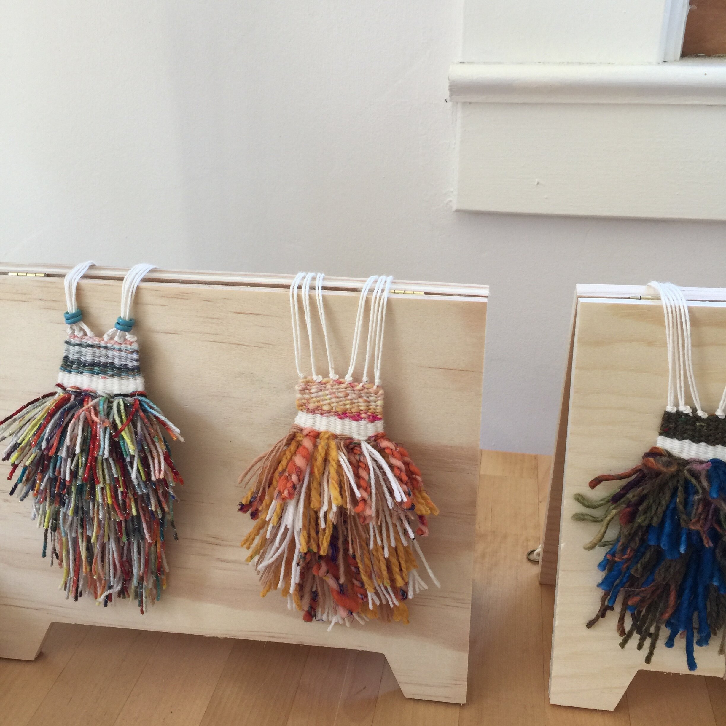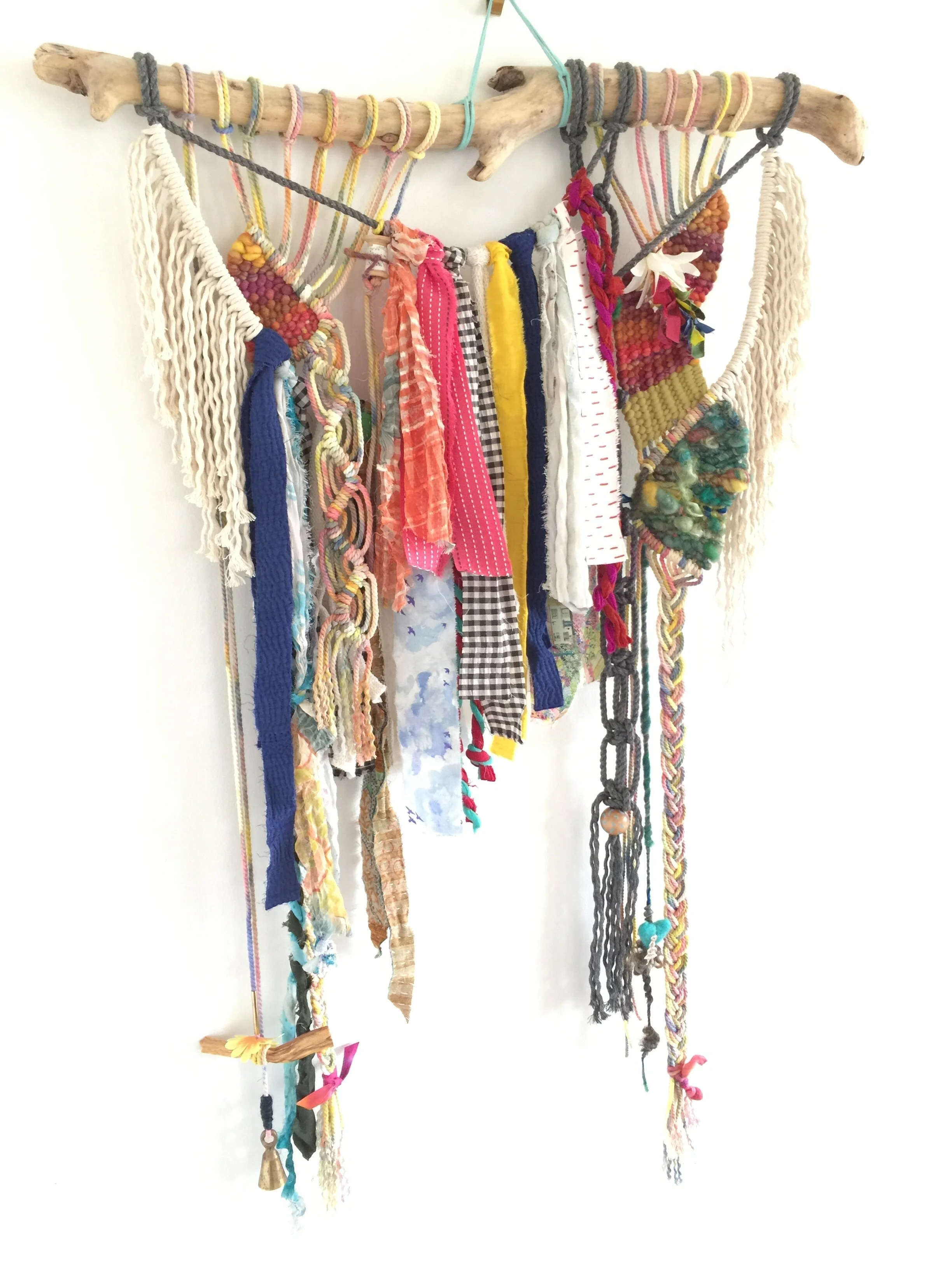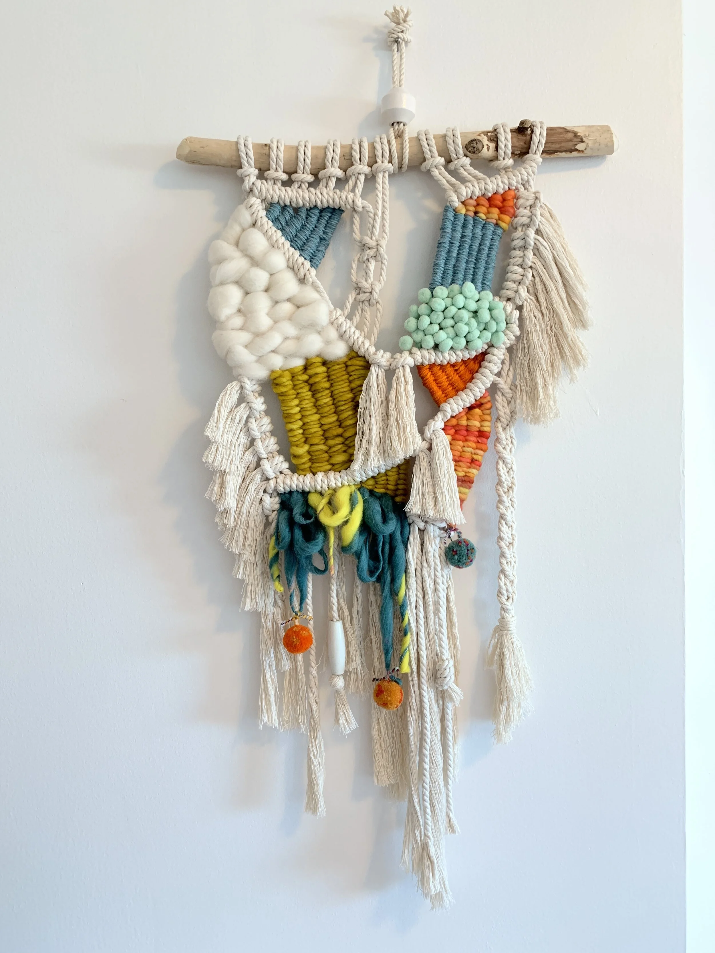 macrame woven wall hanging with ceramic beads, pom poms, and ghost netting