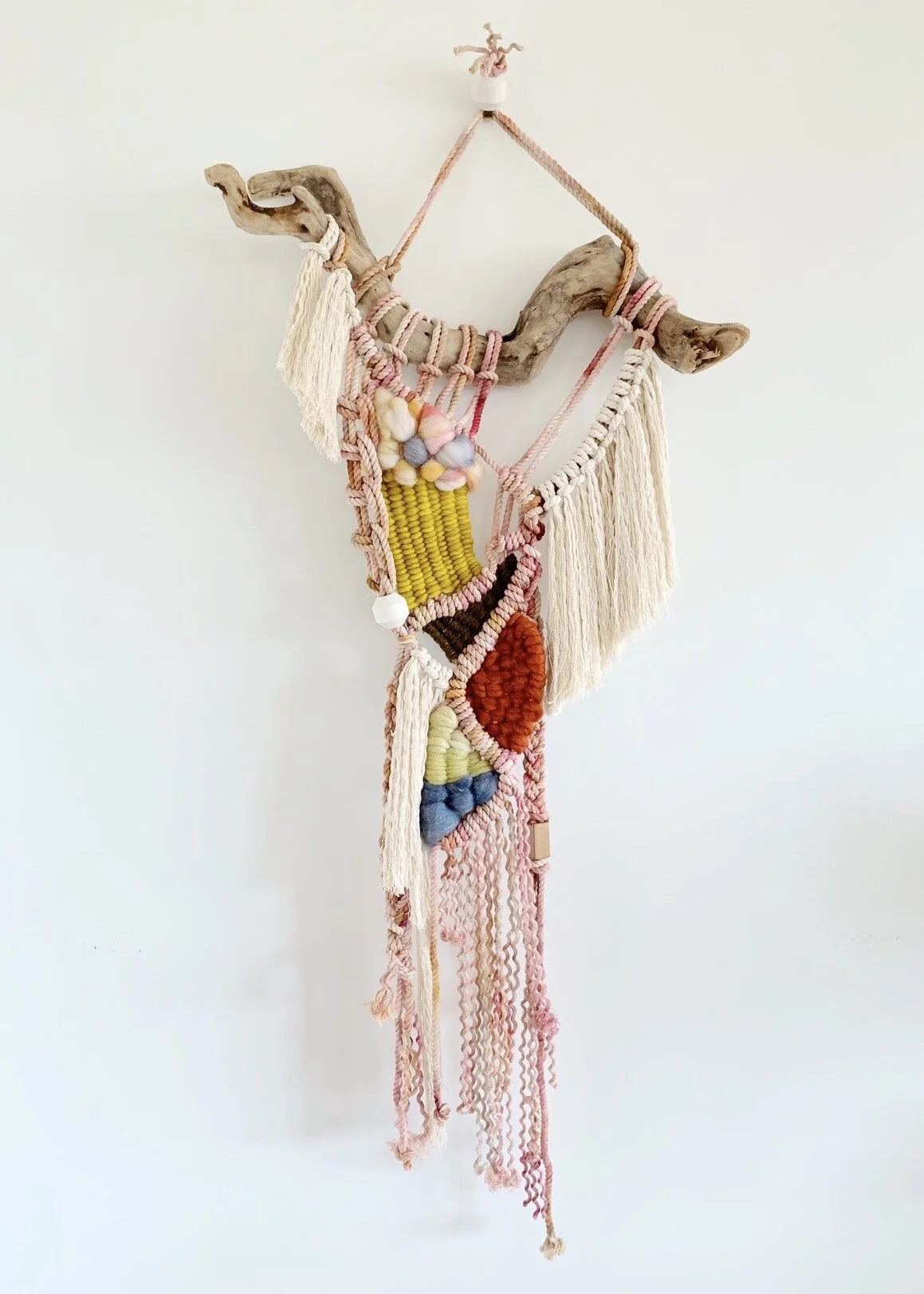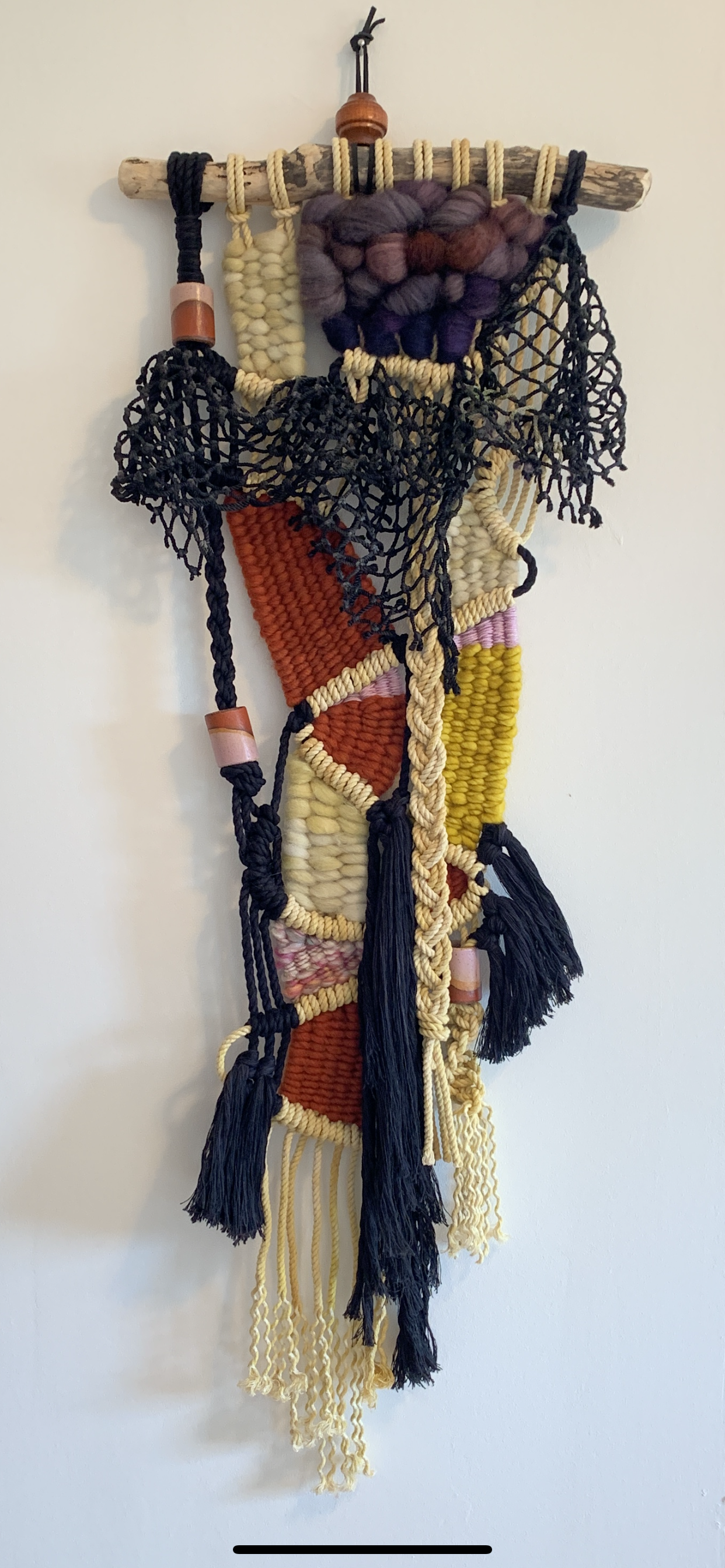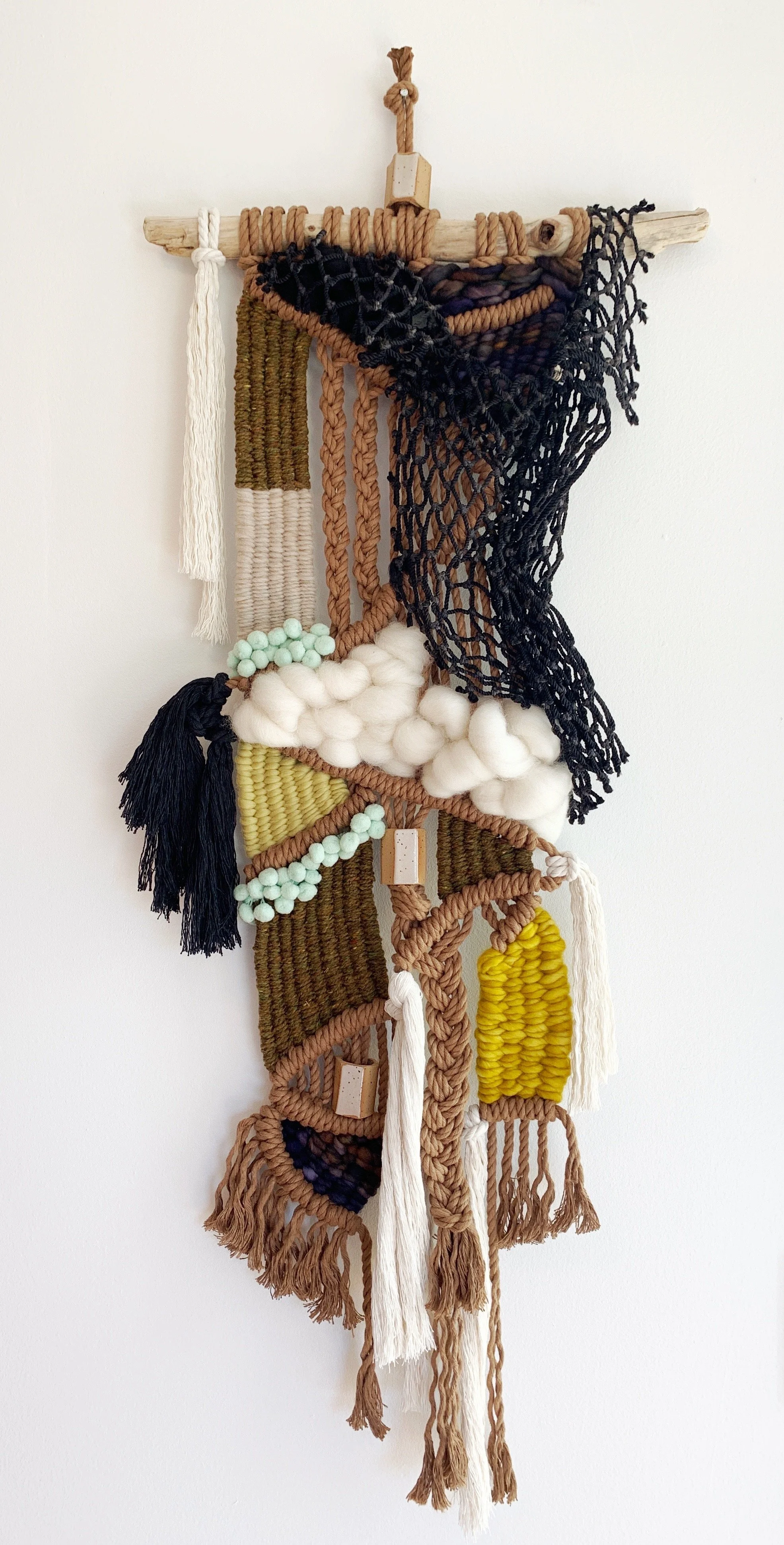macrame woven wall hanging with ceramic bead, wood beads, and ghost netting