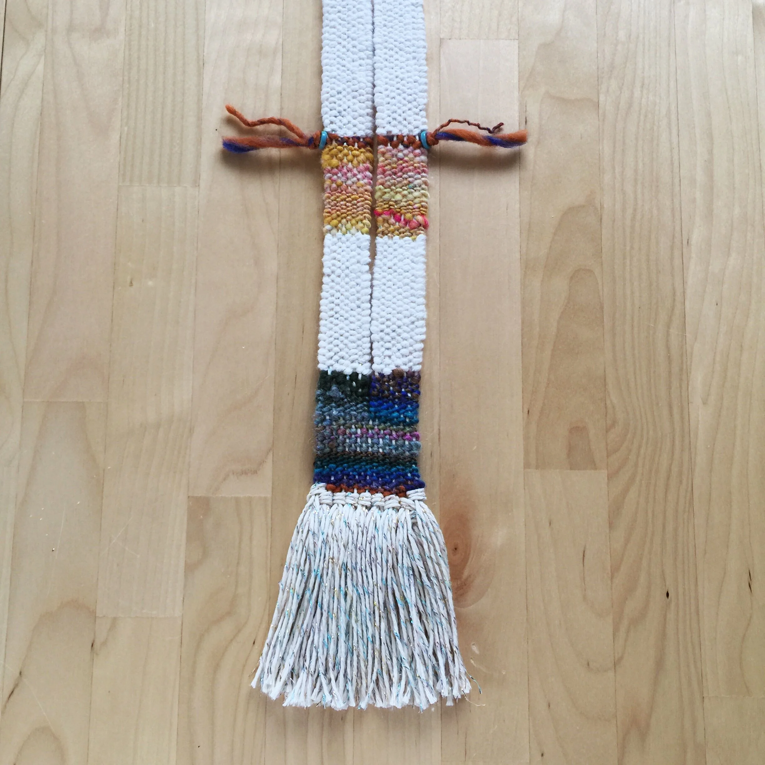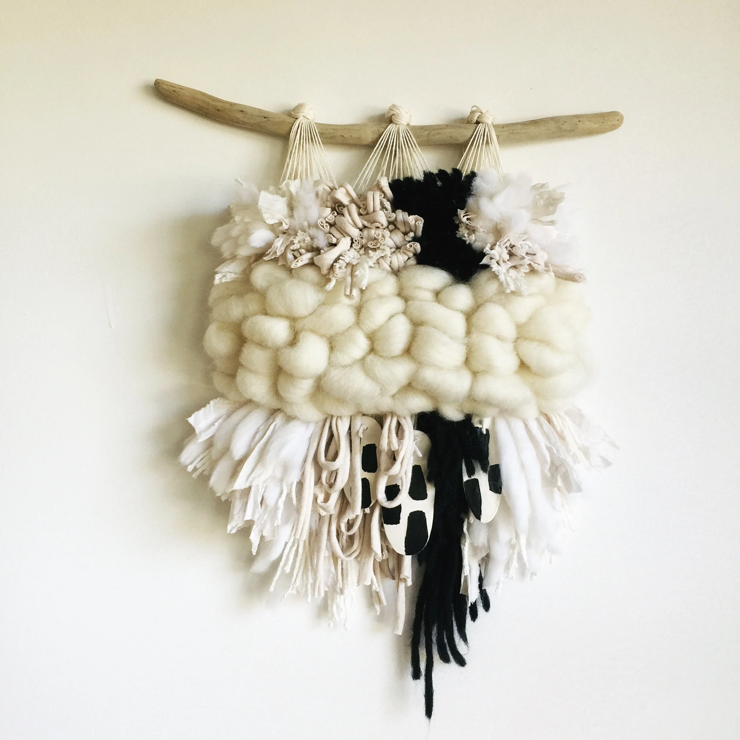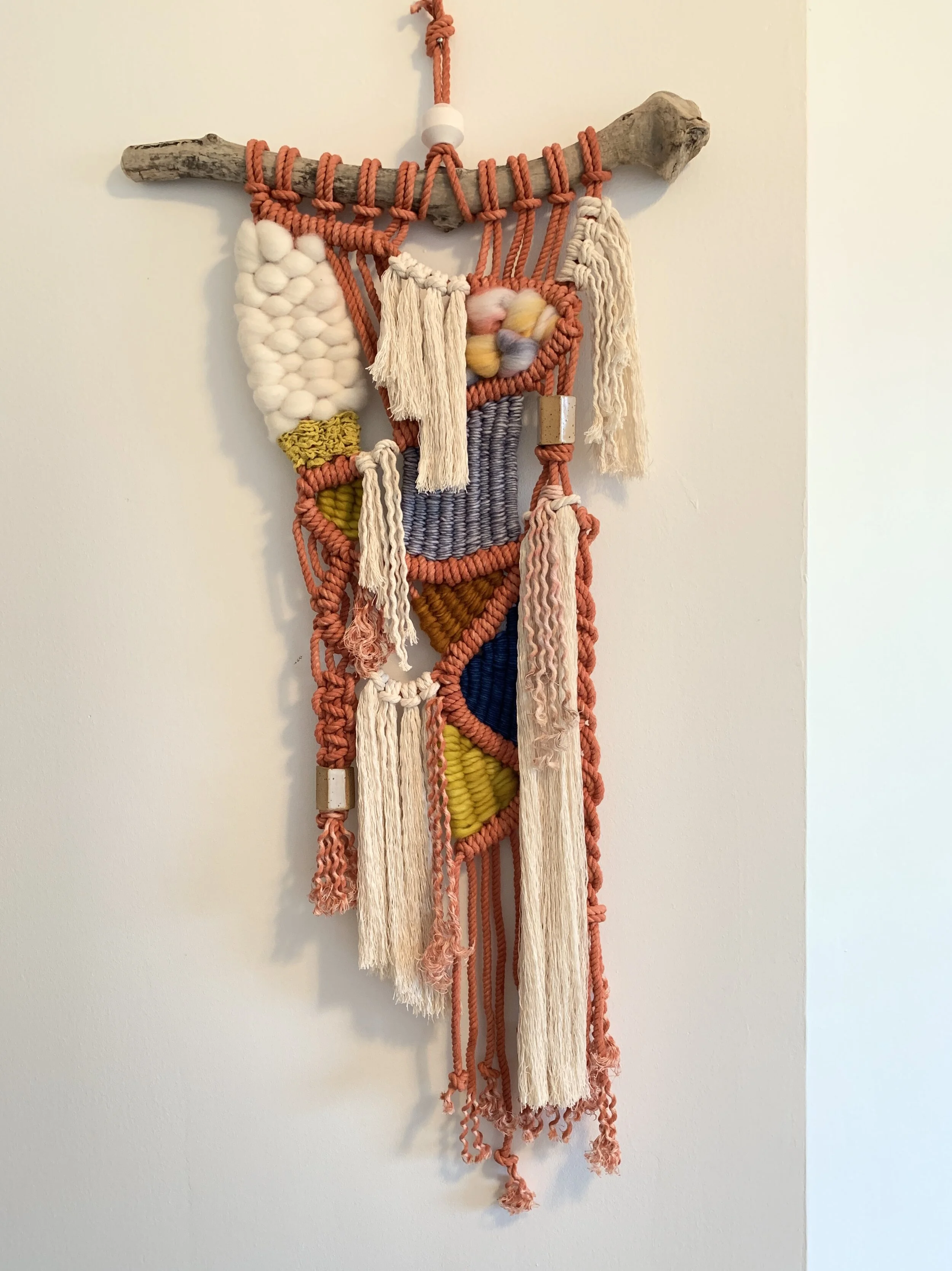 macrame woven wall hanging with ceramic bead, wood beads, and ghost netting